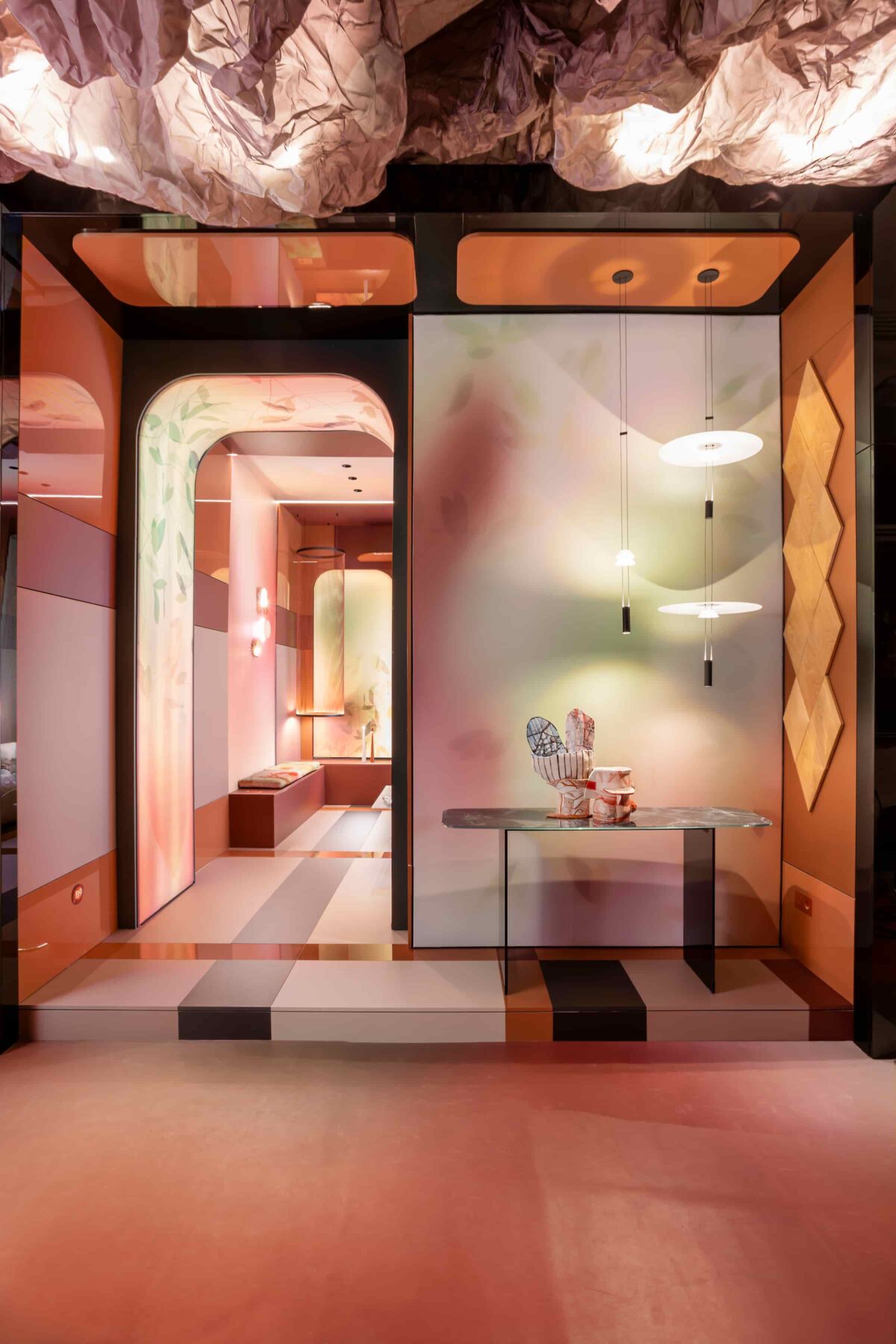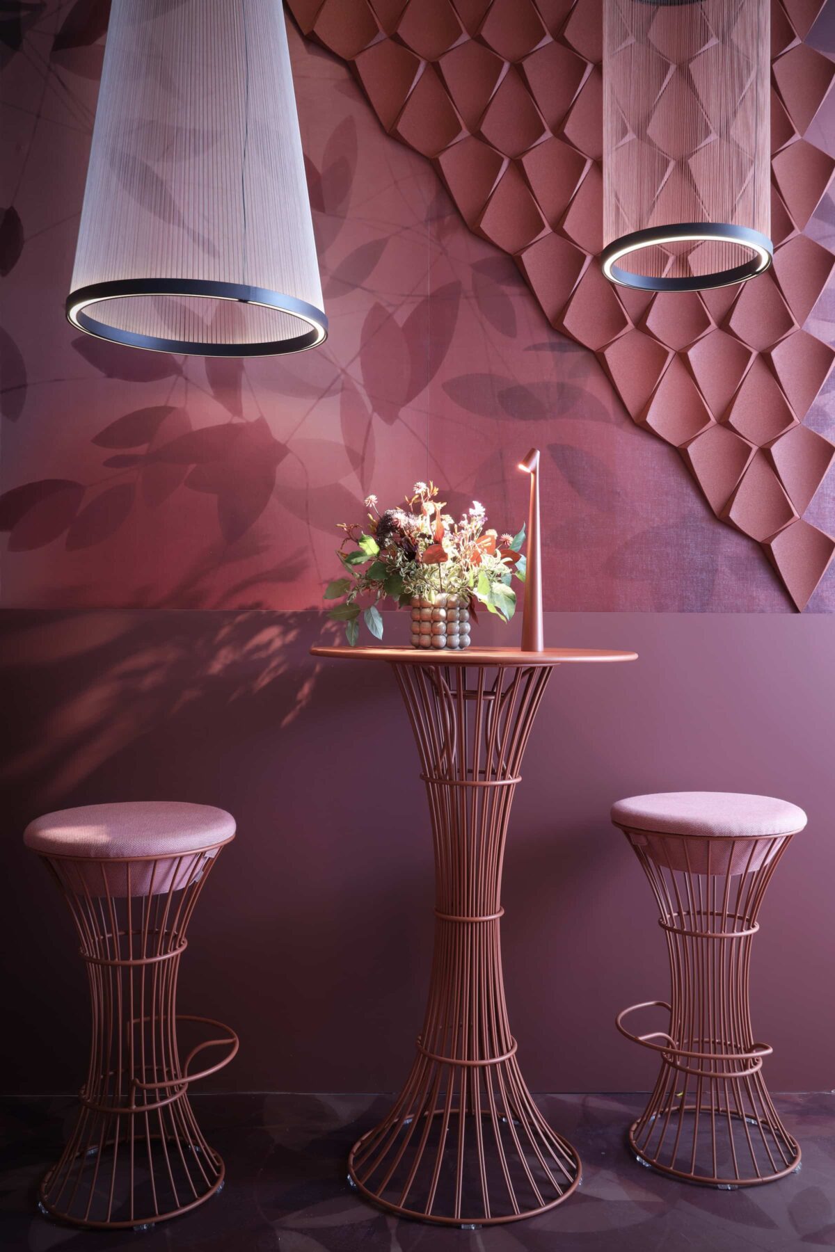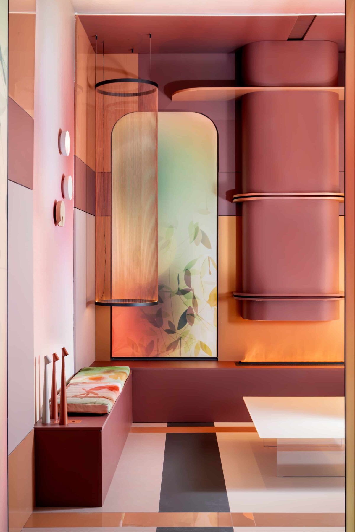 由 Welcome Design 为 MI/AD 打造的 “光影谧境” 空间,因其对 爱维克 ALVIC 材质的卓越运用而脱颖而出,呈现出一个极具感染力与独特气质的设计作品。设计通过细微的光影闪烁与温润的色调,唤醒人们内心深处的记忆。光与材质的结合在 LUXE 高光漆面 与 Zenit 超哑漆面 的映衬下被放大:前者带来明亮与镜面效果,后者则以丝绒般的触感与高度耐久性见长。用于包覆与家具的设计包括莫兰迪红、赤土、鼠尾草绿,以及独特的 ZENIT 绒金铜饰面。