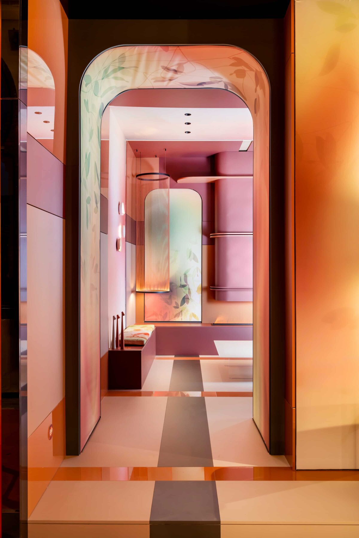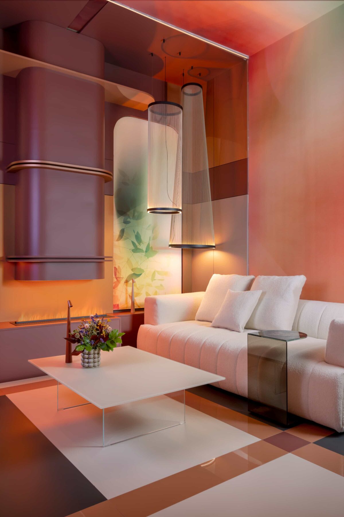 由 Welcome Design 为 MI/AD 打造的 “光影谧境” 空间,因其对 爱维克 ALVIC 材质的卓越运用而脱颖而出,呈现出一个极具感染力与独特气质的设计作品。设计通过细微的光影闪烁与温润的色调,唤醒人们内心深处的记忆。光与材质的结合在 LUXE 高光漆面 与 Zenit 超哑漆面 的映衬下被放大:前者带来明亮与镜面效果,后者则以丝绒般的触感与高度耐久性见长。用于包覆与家具的设计包括莫兰迪红、赤土、鼠尾草绿,以及独特的 ZENIT 绒金铜饰面。