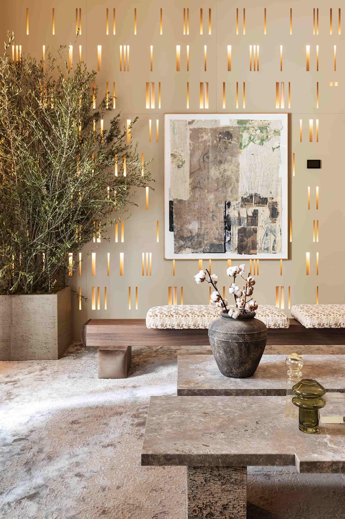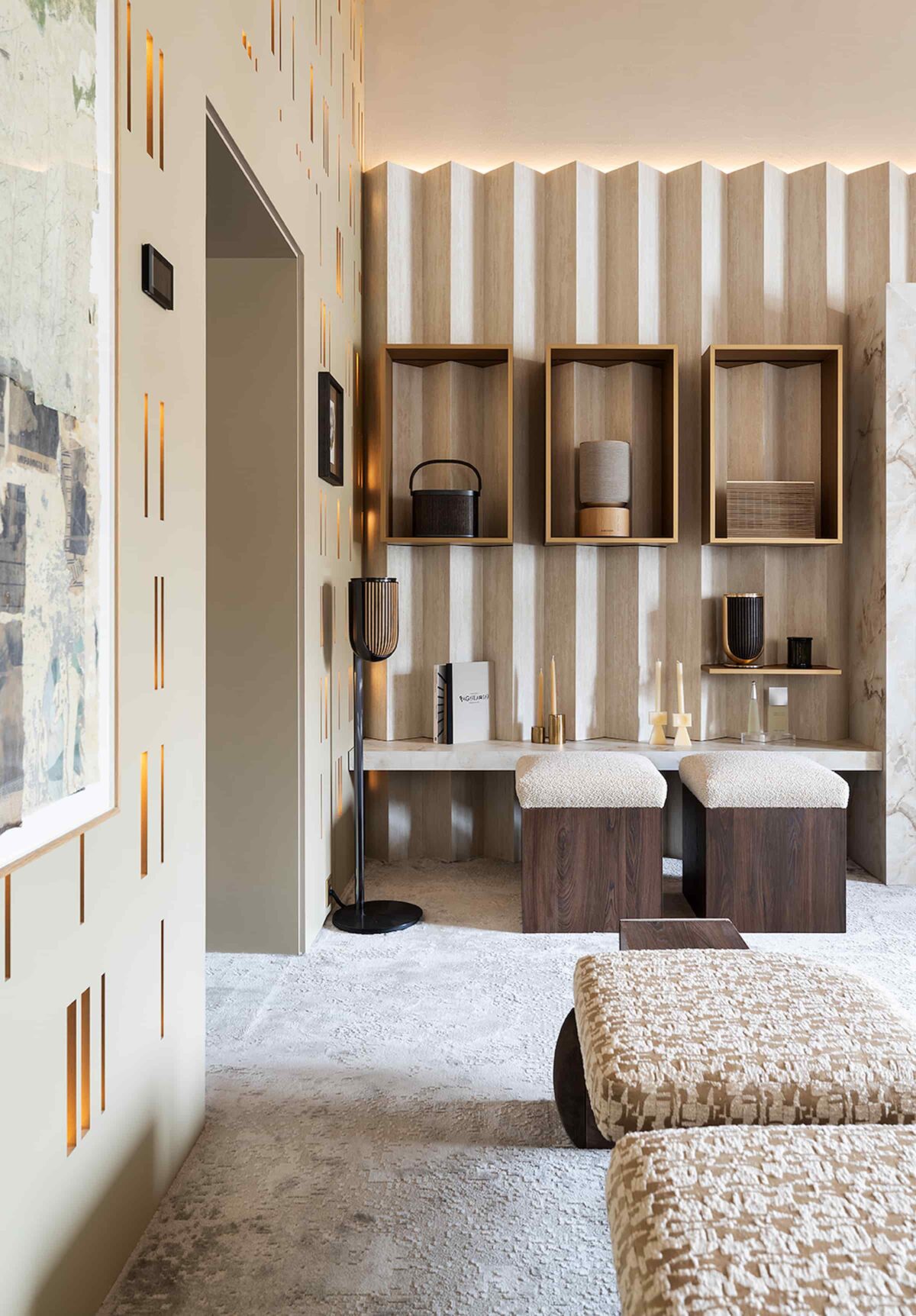 最终的点睛之笔则来自 ZENIT 绒金沙金饰面,其真实的金属光泽与丝滑表面被用于装饰立方体,为整体空间注入奢华的当代气质。