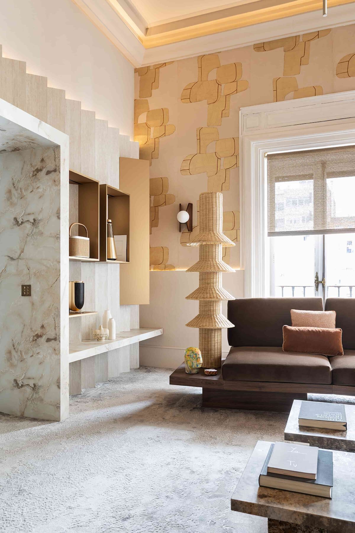 在灯光与氛围营造方面,墙面使用 ZENIT 姜黄的超哑漆面包覆,并点缀小型光窗,令空间在光影交织中更具层次感。同时,朵云 01 玛瑙纹亦被用于家具与门洞设计,呈现出自然石材的优雅质感。