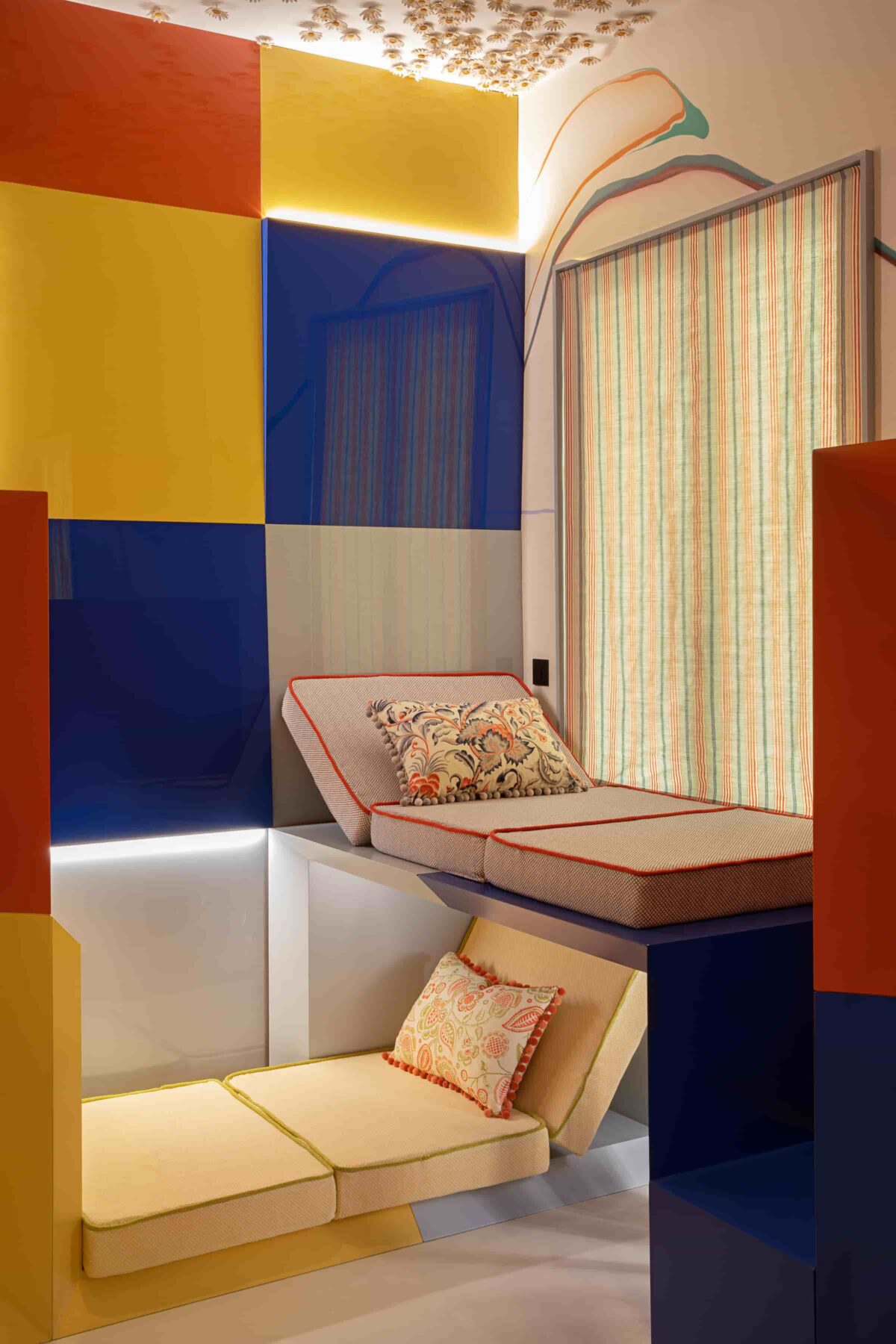 此次使用的艺术系列色彩包括:阿尔贝罗黄、柑橘橙、庞贝红、薰衣草紫、冰蓝、深海蓝、海军蓝。设计师 Guillén 通过精妙的木作艺术,将这些色彩以平衡的方式融入家具,结合 Luxe 高光工艺 与 Zenit 3.0 超哑工艺,使空间成为一幅充满艺术张力的生活画卷。